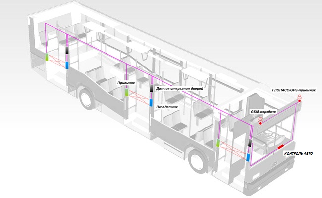 Второй вариант - датчики подсчета пассажиров устанавливаются в дверной проем транспортного средства в механизме открывания/закрывания дверей. Каждый датчик имеет в своём составе две активные компоненты, которые излучают узкий фронт, растянутый вдоль ступеньки. Принцип действия датчиков — измерение расстояния до объекта каждым из 2-х фронтов. Пердача данных осуществляется через ГЛОНАСС/GPS терминал средствами GSM передачи данных.